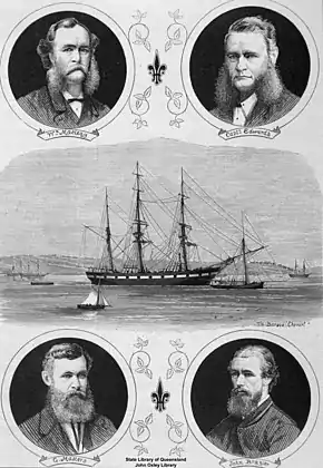 Macleay sought ships for his expedition with Captain Edwards, and at Mort's Dock on 22 February 1875, they encountered the barque Chevert.[12] The boat was constructed between 1850 and 1863 and had historically been a transport vessel used for colonial advancement under the rule of both the English and French within the Pacific and Indian Ocean.[2] The surveyor who examined the boat provided positive feedback, and Macleay bought it in early 1875 for £3000.[10][12] The barque was then adjusted and rectified to suit Macleay’s unique expeditionary requirements.[12] In further preparation, guns and additional apparatus were organised, personnel were assigned, food was stocked, and units of sample storage were assembled, as was a steam launch.[12] Further, a picnic was organised by the Linnean Society of New South Wales in the weeks preceding the expedition.[13] Notable political figures and members of the academia of Sydney such as Premier John Robertson; Attorney General William Dalley, and Professor Charles Badham of the University of Sydney attended, as did the Consul of France, Eugène Simon, and Lieutenant Henri Villemot, Commandant of Cher.[13] Badham presented a speech to the attendees, in which he praised France for its historical assistance in advancing the "civilisation of nations".[14] Simon also presented a speech in which he commended Macleay for his scientific endeavour, correlating scientific discovery and knowledge to national progression.[14] Additionally, he communicated his perception of the importance of the expedition in defining Australia's international scientific status.[15]