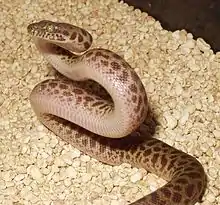 Children's python (Antaresia childreni) is a species of nonvenomous snake in the family Pythonidae. The species is named after John George Children. It is a nocturnal species occurring in the northern half of Australia and generally found on the ground, although it often climbs trees. Usually growing to about 1.0 m (3 ft) in length or more depending on the polymorphic variant, it is typically a reddish-brown colour, darker on the upper surface, and with many darker blotches, especially on younger specimens. The Stimson's python variant has much stronger and more variable colours; often being adorned with reddish-brown to chocolate blotches against lighter tan.[4] It feeds mostly on small mammals and birds, and as with other pythons, it constricts its prey before swallowing it whole. It is a popular pet among reptile enthusiasts.