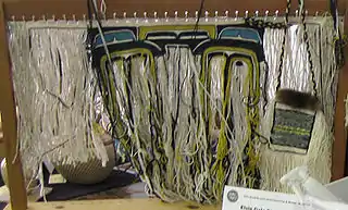 Chilkat weaving is one of the most complex weaving techniques in the world. It is unique in that the artist can create curvilinear and circular forms within the weave itself. A Chilkat robe can take a year to weave. Traditionally mountain goat wool, dog fur, and yellow cedar bark are used in Chilkat weaving.[5] Today sheep wool might be used. The designs used Northwest Coast formlines, a traditional aesthetic language made up of ovoid, U-form, and S-form elements[6] to create highly stylized, but representational, clan crests and figures from oral history—often animals and especially their facial features. Yellow and black are dominant colors in the weavings,[5] as is the natural buff color of the undyed wool. Blue can be a secondary color.[7] Looms used in Chilkat weaving only have a top frame and vertical supports, with no bottom frame, so the warp threads hang freely. The weaver works in vertical sections, as opposed to moving horizontally from end to end.[5] Consequently, many designs are broken into vertical columns. As with most Northwest Coast art, these columns are bilaterally symmetrical.