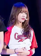 In January 2016, Choi joined Produce 101 along with Kim Do-yeon and three other Fantagio trainees with the hopes of debuting in an eleven-member girl group which would promote for a year under YMC Entertainment.[8] Choi initially gained popularity for being chosen by vote as the center for the show's theme song "Pick Me", which had its music video premiere a month before the first show aired on the December 17, 2015 episode of M Countdown.[9] Both Choi and Kim rose to high ranks during the program and eventually placed 3rd and 8th respectively in the show's finale on April 1, 2016, which allowed them to debut as members of I.O.I.[10] On May 4, 2016, I.O.I released their debut single "Dream Girls" which had its rap parts penned by Choi and Im Na-young. Both members also wrote the lyrics for the EP's intro track "I.O.I". The group also promoted as a seven-member unit which Choi was also a part of with Kim, releasing the single "Whatta Man" on August 9, 2016.[11][12] As part of I.O.I, Choi also released an OST with the unit and also collaborated with fellow members Chungha, Jeon Somi and fellow Produce 101 contestant Ki Hui-hyeon for the digital single "Flower, Wind and You".[13] The song charted at number 42 on the Gaon Digital Chart.[14] She also appeared in the music video of her label-mate ASTRO's song "Breathless" which was released on July 1, 2016.[15] In November 2016, Choi joined the cast of Mnet's music variety show Golden Tambourine.[16] She then released the single "Rise and Fall" together with Yoo Se-yoon, Shim Hyung-tak and Jo Kwon as part of the show's official soundtrack.