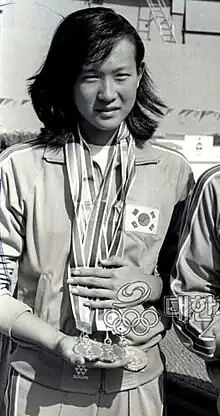 Choi is the younger sister of Choi Yun-jung,[lower-alpha 1] who also competed internationally for South Korea in swimming. The two were nicknamed the "Seal Sisters", and were noted frequently for both breaking national backstroke records at the same time.[5] Choi began learning to swim while in kindergarten through lessons at the YMCA.[6] Both sisters attended Seoul National University Middle School,[lower-alpha 2] and represented their school in swimming at the national level.[7] Following the 1984 Olympics, she won gold in the 100 m and 200 m backstroke at the 1986 Asian Games.[8]