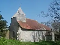 The church is constructed of flint and rubble.[5] The bell turret is weatherboarded, with a "shingled spirelet".[1] The building is listed Grade I.[2]