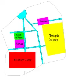 Following the siege of Jerusalem in AD 70 during the First Jewish–Roman War, Jerusalem had been reduced to ruins. In AD 130, the Roman emperor Hadrian began the building of a Roman colony, the new city of Aelia Capitolina, on the site. Circa AD 135, he ordered that a cave containing a rock-cut tomb[lower-alpha 3] be filled in to create a flat foundation for a temple dedicated to Jupiter or Venus.[3][12] The temple remained until the early fourth century.[13][14]