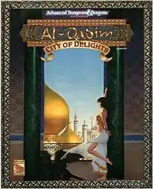 City of Delights is set in the Al-Qadim campaign setting, which focuses on the fictional land of Zakhara. The book describes Zakhara's principal city, the Golden City of Huzuz – huge, filled with every imaginable item and service, and saturated with intrigue and mystery. Each of the 800,000 citizens has a story, such as: how the merchant Khwaja al-Danaf gained his fortune; how the Talking Bird and Singing Tree came to the garden in the Palace of the Enlightened Throne; and how the Caliph's elven concubine Halima gained a winged cat.[1]