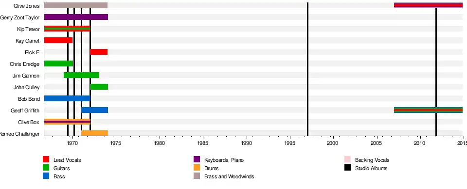 The band originally formed in 1966 as Pesky Gee! with Kay Garrett (lead vocals), Kip Trevor (lead vocals, guitar and harmonica), Chris Dredge (guitar), Bob Bond (bass guitar), Clive Box (drums and piano), Gerry "Zoot" Taylor (organ), Clive Jones (aka Clive Beer-Jones; saxophone and flute).[3] Jim Gannon (guitar, vocals and vibes), replaced Dredge in spring 1969.