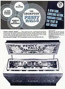 The first recognizable coin pusher was Penny Falls, created by Alfred Crompton Ltd (later Crompton's Leisure Machines, LLC) in 1964.[1][2] Penny Falls featured a single, large, moving playfield divided into 12 sections, where 12 players could play simultaneously. Players added coins to the playfield by inserting their own coins through a chute, and could collect any coins that were pushed off the edge of the playfield from a corresponding trough on the side of the machine.
