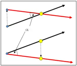 Parallax is an angle subtended by a line on a point. In the upper diagram, the Earth in its orbit sweeps the parallax angle subtended on the Sun. The lower diagram shows an equal angle swept by the Sun in a geostatic model. A similar diagram can be drawn for a star except that the angle of parallax would be minuscule.