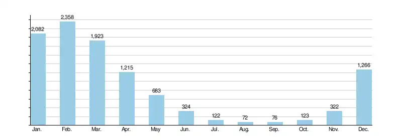 The annual precipitation in the Cottonwood Creek watershed is 36 inches (910 mm), with a range from 60 inches (1,500 mm) in the mountains to 25 inches (640 mm) in the lowlands.[5] The vast majority occurs between December and April, with the result that the "creek" is often a large river during the winter and spring, while dwindling to a relative trickle in the summer and fall. Because of the relatively low elevation of the watershed, the vast majority of the flow comes from rain, although in some years significant snowpack can accumulate in the mountains and raise flows during a late spring melt. Because of the rugged topography and seasonality of precipitation, the Cottonwood Creek is highly prone to flash flooding. The average annual discharge is about 860 cubic feet per second (24 m3/s); the average summer flow is only 50 to 100 cubic feet per second (1.4 to 2.8 m3/s), while winter flows routinely reach thousands of cubic feet per second.[3][5]