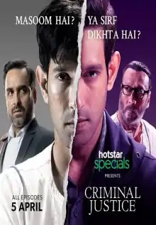 Criminal Justice is an Indian Hindi-language crime thriller legal drama web series for Hotstar Specials, based on the 2008 British television series of the same name,[1] written by Shridhar Raghavan and was directed by Tigmanshu Dhulia and Vishal Furia. Starring Pankaj Tripathi, Vikrant Massey, Jackie Shroff, Anupriya Goenka and Mita Vashisht in lead roles, the storyline follows the life of individuals on a gut-wrenching journey through the criminal justice system.