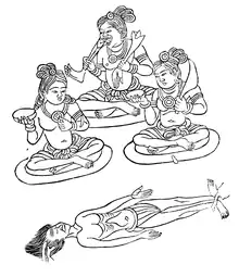 The ḍākinī imagery arrived in Japan via Kūkai's introduction of Tangmi (East Asian esoteric Buddhism) to the country in the beginning of the 9th century (early Heian period) in the form of the Shingon school.[24] The Womb Realm (Garbhakoṣadhātu) Mandala, one of the two main mandalas of Shingon Buddhism, depicts three ḍākinīs in the southern (right-hand side) part of the mandala's Outer Vajra section (外金剛部院, gekongōbu-in) in the court of Yama (Enmaten in Japanese), next to the Saptamātṛkās and other similar deities. The figures are half-naked and seated on circular mats next to a human corpse. One of the ḍākinīs is shown devouring a human arm and a leg; the other two hold skulls (kapāla) in their right hands, and one holds a chopper in her left hand.[25] All in all, the ḍākinīs represented in this mandala are more akin to the demonesses of Hindu and early Buddhist texts and iconography than the female personifications of enlightenment found in Tibetan Buddhism.[24]