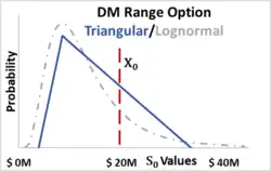 Fig. 8 DM Range Option with triangular distribution. (Background: comparable lognormal distribution.)