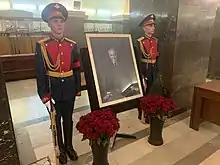 Gorbachev's body lay in state on 3 September within the Pillar Hall of the House of the Unions in Moscow, which has historically been used to hold state funeral services for high-ranking officials and leaders, including for Joseph Stalin after his death in 1953.[4][5] Notably, unlike his successor, Boris Yeltsin, Gorbachev would not be granted a state funeral. However, Kremlin spokesperson Dmitry Peskov did announce that Gorbachev would be given "elements of a state funeral", such as a guard of honor and partial government organization.[6] It was also announced that Russian president Vladimir Putin would not attend Gorbachev's funeral, a move that attracted media attention.[7] A statement from the Kremlin alleged this was due to his busy schedule.[8][9]