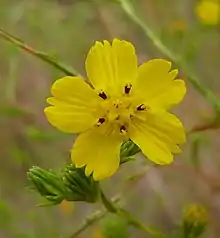 Each flower head has a center of six yellowish disc florets with black stamens surrounded by five yellow ray florets. The ray florets generally have three teeth, the central tooth being the smallest.[3] Plants flower in May through October.[4]