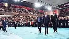 Following MHP's defeat in the 2015 election, high ranking MHP members demanded Bahçeli's resignation as chairman. When he refused, 547 delegates put forward their demands to convene an extraordinary congress.[38] Important names such as Meral Akşener, Sinan Oğan, and Koray Aydın called for a congress and announced that they were candidates for the chairmanship, however Bahçeli rejected the calls for an extraordinary congress and announced 18 March 2018 as the date of a regular congress.[39] A lawsuit was filed by Bahçeli's opposition on the grounds that their demands were not met and that the party be taken to an extraordinary congress.[40] The party leadership requested the Constitutional Court to make a decision.[39] The court ruled in favor of Bahçeli's opponents, mandating MHP to convene an extraordinary congress with the Supreme Court unanimously approving the decision.[41] The 6th Extraordinary Grand Congress of the MHP convened on 19 June 2016 with the participation of six candidates who declared their candidacy against Bahçeli. In the congress, which was officially a bylaws convention, it was confirmed that a number of amendments to the party's charter had been decided on, even though the headquarters claimed otherwise. With the amendment proposals accepted in the congress, 13 articles in the party bylaws were renewed. Among the amendments, an article in MHP's charter which prevented the election of chairmen in extraordinary congresses was changed to allow so.[42] However the execution of the decisions reached in the convention was stopped with the decision of the Court of Cassation.[43] Following this decision of the Supreme Court of Appeals, Akşener filed a complaint with the Supreme Election Council (YSK) for 'complete unlawfulness' regarding the rejection of the request for an extraordinary congress with elections.[44]