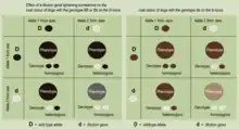 The dilute gene d is recessive to the wild type allele D. A gene test can be used to determine a dog's genotype concerning genes for pigmentation. In some dog breeds lightened by the dilute gene, the mutation d is associated with color dilution alopecia (CDA). Since not all breeds in which the gene occurs exhibit these problems, it is suspected that there may be a second previously unknown mutation of the MLPH gene.[4][5][6][7]