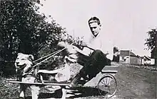 Dog carts pulled by two or more dogs were historically used in Belgium and the Netherlands for delivering milk, bread, and other trades.[1] In early Victorian Britain, dogcarts were associated with bakers, and when they used the area reserved for pedestrians, were considered a nuisance.[2] Dog-drawn carts were prohibited in London in 1840, but some still exist (mainly for reasons of novelty) in France and Belgium for delivering churns of milk from small farms to the dairy.