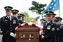 Later, Faith's classification was changed to killed in action, body not recovered. After 62 years in this classification, Faith's remains were recovered near the Chosin Reservoir by a Joint Prisoners of War, Missing in Action Accounting Command (JPAC) field recovery team. His remains were identified through DNA and reported to the public by Defense Prisoner Of War – Missing Personnel Office (DPMO) on October 11, 2012. He was buried in Arlington National Cemetery on April 17, 2013, with full military honors.[6]
