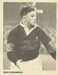 Donald Robinson (4 June 1932[5] – 27 May 2017[6]) was an English World Cup winning professional rugby league footballer who played in the 1940s, 1950s and 1960s, and coached in the 1960s and 1970s. He played at representative level for Great Britain, England, Yorkshire and Rugby League XIII, and at club level for St Joseph's School, Airedale Youth Club, Fryston Colliery, Kippax Juniors, Newmarket Colliery, Wakefield Trinity (Heritage No. 584) (captain), Leeds and Doncaster (Heritage No. 227),[7] as a centre, prop, second-row or loose forward, i.e. number 3 or 4, 8 or 10, 11 or 12, or 13, during the era of contested scrums,[1] and coached at Doncaster and Bramley (late-1970s).
