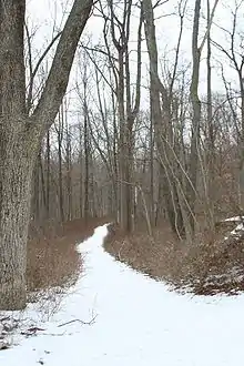 Bear Mountain began to be developed as a park in the early 20th century,[2] and began to expand around 1920, in part by purchasing property from the landowners in Doodletown, as did the separate but contiguous Harriman State Park, where a story that is analogous but less widely noted than Doodletown, concerns the nearby hamlet of Jones Point. By the 1950s, most of the Doodletown residents had moved away, many to nearby Stony Point or into southern Orange County. Those who refused to sell lost their land through eminent domain by 1965,[1] and most of the remaining structures were demolished or disassembled and moved out by the late 1960s. Debris was buried, the roads were closed, and the surrounding woods were allowed to grow over the properties. In the early 1970s, a dam was built on the Timp Brook, creating a sizable pond. The last remaining building, the stone school house, was kept as a shelter for hikers until vandalism caused the park commission to tear it down in 1980.[6]