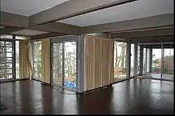 This forms a "base" on which the main level appears to float. The main level is covered with redwood heartwood siding, installed vertically and stained to mimic weathered driftwood. There are large sections of glass windows and doors. The windows and doors have thin metal sashes and wood casings. A tall trim board separates the lower level from the main level between the brick walls and wood siding. The roof appears like a flat plane. The roof is supported by wood rafters spaced 10 feet (3.0 m) on center. The rafters continue through the tops of the walls and support wide overhanging eaves. The owners used the roof as a roof-top deck for viewing the lake.[2]