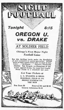 Drake played the first night game at Soldier Field, losing a close contest to Oregon 14–7 on October 3, 1930. This was the first intersectional night game ever played in Chicago, Illinois. The Drake vs. Oregon game was followed by Loyola vs. Georgetown.[14]