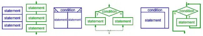 Graphical representation of the three basic patterns — sequence, selection, and repetition — using NS diagrams (blue) and flow charts (green).
