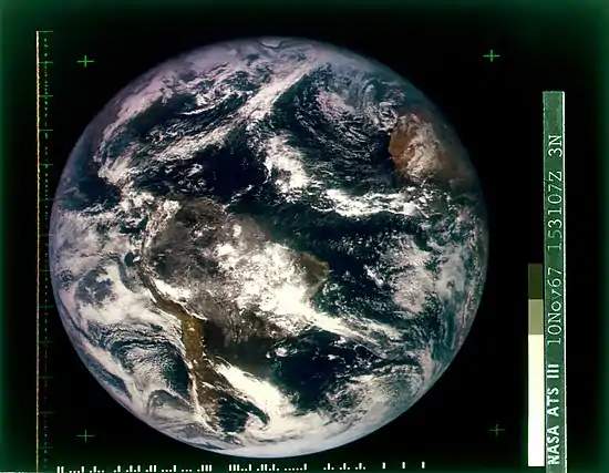 | 1967 | 10 November 1967: NASA's first full-disc, true-color image of Earth, taken by the ATS-3 satellite. The image was used for the cover of the first edition of the Whole Earth Catalog the following year. | ![]() | |