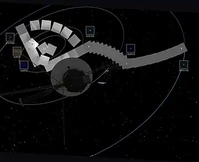 | 1990 | 14 February 1990: the Voyager 1 space probe took the Pale Blue Dot photograph of Earth from a record distance of about 6 billion kilometers (3.7 billion miles, 40.5 AU), as part of that day's Family Portrait series of images of the Solar System. Earth appears as a tiny dot within deep space: the blueish-white speck almost halfway up the brown band on the right. Diagram of the Family Portrait showing the planets' orbits and the relative position of Voyager 1 when the mosaic was captured. |