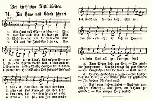The hymnic melody, reminiscent of a Prussian military march,[3] is suitable for festive occasions and processions. In the traditional and Pre-1975 lyrics, the last lines are the refrain: "Gott, wir loben dich, Gott, wir preisen dich. O lass im Hause dein uns all geborgen sein" (God, we laud You, God, we praise You. O let us all be sheltered within Your house). Their melody moves up and forward.[4]