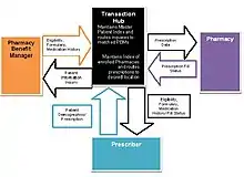 The transaction hub provides the common link between all actors (prescriber, pharmacy benefit manager, and pharmacy). It stores and maintains a master patient index for quick access to their medical information as well as a list of pharmacies.[3]