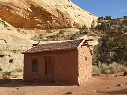 The Behunins lived there for only a year, leaving for Fruita after a flood threatened the house and its fields. The one story sandstone structure measures 13 feet (4.0 m) by 16.5 feet (5.0 m), with a single room. Elijah and his wife and their 13 children all lived within the home. The walls are sandstone covered with a plaster-cement wash. The roof structure is wood, covered with wood sheathing and bentonite clay. The cabin was renovated in the 1960s by the National Park Service and represents the most intact example of a settler cabin in Capitol Reef National Park.[2]
