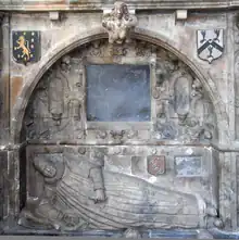Monument to Elize Hele in Bovey Tracy Church, Devon. Below his effigy are the kneeling effigies of his two wives, facing each other in prayer, behind the left one kneels his young son.[4] On top at each side is an escutcheon displaying the arms of Hele impaling Hender (dexter) and Bray (sinister)