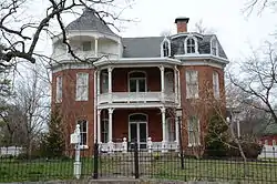The Elliott House is a historic house at 303 South Third Street in Bentonville, Arkansas. It is a large three-story brick house with Italianate style, built in 1887 for Harry Elliott, who made a fortune investing in silver mines in Silver City, New Mexico. The house is distinctive for its use of brick on the interior as well as exterior walls; those on the inside are 8 inches (20 cm) thick, those outside are 16 inches (41 cm). The exterior features include seven porches, a widow's walk, and carved brackets in deeply overhanging eaves.[2]