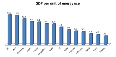 Energy Intensity of different economies The graph shows the amount of energy it takes to produce a US $ of GNP for selected countries. GNP is based on 2004 purchasing power parity and 2000 dollars adjusted for inflation.[3]