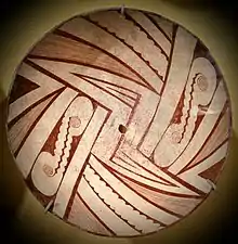 Tony Berlant and coauthors believe that many of the designs on prehistoric Mimbres pottery, such as this one with characteristic zig-zag designs, are entoptic images from ingesting psychoactive Datura plant extracts. The four spirals are interpreted as representing Datura buds.[1][2]