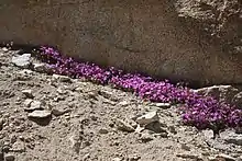 Epilobium obcordatum is a species of perennial plant in the evening-primrose family (Onagraceae), known by the common name rockfringe willowherb and rock fringe.[1] It is native to the western United States from California to Idaho, where it is found in rocky mountainous areas, at altitudes of 7,000 ft (2,100 m) to 13,000 ft (4,000 m).[2] This small perennial is clumpy to mat-forming and spreads from a woody caudex, especially in nooks between rocks. It has stems lined with oval or rounded leaves which spread parallel to the ground or ascend somewhat. At the tips of the thin stems are flowers each with four petals. The petals are magenta to purple, rounded and notched, often in a perfect heart shape, and are one or two centimeters long. The glandular, club-like, ridged fruit is a capsule two to four centimeters long growing on a short stalk.