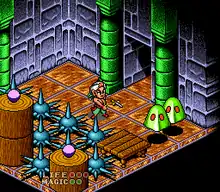 The isometric perspective results in artifacts in terms of distances between sprites. Some critics viewed this as optical illusions intended to test the player, but others criticized it as a technical flaw.[lower-alpha 5] Detractors wrote the issue was especially noticeable with the collision detection of enemies, joking that the foes were surrounded by a big invisible forcefield of death.[3][11][20][34] Frank of Super Action reported the unclear perspective caused jumps to be incredibly hard, especially those that require Glendaal to be on the edge of a platform; in these situations, the player would need "almost supernatural depth perception", where the sprite would appear to float next to a platform when actually on the edge.[4] Game Power suggested the unclear perspective was a result of a lack of shadows.[9] Even from reviewers who found the unclear perspective intentional, responses were mixed. The Elf of Superjuegos found it an "ingenious" design choice, and Super Control journalist Paul dismissed it as a "cop-out" for designing puzzles legitimately.[5][8] A critic from German magazine Video Games said it led to unfair platform puzzles because one mistake could cause instant death.[10] Game Zone's Andy Butcher wrote that the isometric view meant it takes time to adjust to the controls, as the D-Pad is in relation to the perspective.[11]