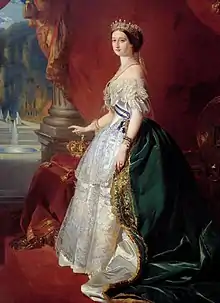 In March 1839, on the death of their father in Madrid, the girls left Paris to rejoin their mother there.[16] In Spain, Eugénie grew up into a headstrong and physically daring young woman, devoted to horseriding and a range of other sports.[17] She was rescued from drowning and twice attempted suicide after romantic disappointments.[18] She was very interested in politics and became devoted to the Bonapartist cause, under the influence of Eleanore Gordon, a former mistress of Louis Napoléon.[17] Due to her mother's role as a lavish society hostess, Eugénie became acquainted with Queen Isabella II of Spain and the prime minister Ramón Narváez. María Manuela was increasingly anxious to find a husband for her daughter and took her on trips to Paris again in 1849 and England in 1851.[19]