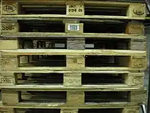 The EUR-pallet, also known as Euro-pallet or EPAL-pallet, is the standard European pallet as specified by the UIC pallet working group and the UIC 435-2 leaflet.[1] Pallets conforming to the standardization are eligible for the European Pallet Pool (EPP), the system which allows for an exchange as "pallet for pallet".