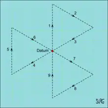 A sector search, also known as a Victor Sierra (VS) by the US and Canadian coast guards is a search pattern suitable for a small object in a well defined location that covers a circular area centred on a reported position using a route made up of straight line segments that efficiently covers a circular area, and is adapted to account for drift. First the search vessel makes a measurement of the drift speed and direction, using a datum drift marker to indicate the drift in real time. The pattern is steered relative to the datum marker, and the track over the ground may look considerably different due to superposition of drift. By steering by compass and directly towards the drifting datum every third leg, the search vessel drifts the same amount as the datum, which is the assumed amount of drift for the target. If the initial sector search – often started in approximately drift direction – is unsuccessful, a second sector search can be offset by 30° to either side to give better coverage of the same mass of surface water.[1][2]