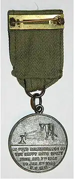 As the division was resting and refitting in Melbourne, Australia after the campaign, Colonel (later Major General) Merrill B. Twining suggested that a commemorative medal be struck. He suggested that the ribbon be made of worn olive drab cotton twill fabric of the USMC M1941 utility uniform and bear the inscription “Let George Do It”, the division's informal motto from its training days when its personnel seemed to draw more than their fair share of onerous assignments. The motto was translated into Latin by British coastwatcher Captain Martin Clemens, who was also awarded the medal. The artist was Captain (later Colonel) Donald L. Dickson, who drew the designs on captured Japanese postcards using a half dollar to draw the circles. The cost to receive a medal was one Australian pound. About 45 officers and senior enlisted men signed up to receive a medal.[2]