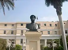 The school of medicine was called el-Demerdash School of Medicine, before establishment of the university. The original El-Demerdash Hospital was established on August 5, 1928, by a generous grant from El-Demerdash Pasha[4] and his wife and daughter. It was built on 12,400 square metres, and had 90 beds and the following sections: quarters for a resident physician and chief nurse, two wards, a surgery unit, out-patient clinic, a laboratory, kitchen, laundry room, isolation ward, an autopsy department and a mosque containing the mausoleum for the El-Demerdash family. The foundation of the hospital was witnessed by many people representing all the society of Egypt and also by the two most powerful figures in the country in that time: Lord George Lloyd (later on George Lloyd, 1st Baron Lloyd), the British high commissioner, and Prime Minister of Egypt Mohamed Mahmoud Pasha. The opening ceremony was covered by Al Ahram, The Times and the Near East journals.[4] It was officially opened on May 5, 1931. A memorial metallic plate and a marble monument were erected to mark this event.