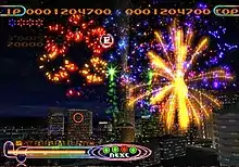 Fantavision is a real-time puzzle game that relies on quick color matching and symbol recognition skills from the player. The game consists of a series of stages set in darkened, 3D environments where brightly colored fireworks called '"flares" are launched onto the screen and will hover for a period of time before disappearing. Using the DualShock 2's left analog stick, the player controls the direction of a guideline ray extending from a circular cursor that allows a flare along the ray to be "captured" with the controller's X button. The goal is to string together three or more flares of the same color and then detonate them by pressing the circle button, thus increasing the player's score.[8][9][10] Different types of flares can be encountered including "peonies", which explode in a circular fashion; "willows", which have sparks that descend downward in dome shape; and "multiflares", which break apart into smaller pieces that can be detonated a second time.[8] More points can be obtained with chain reactions caused by new flares touching the sparks of detonated flares of the same color. This creates a "daisy chain" that allows flares of multiple colors to be detonated simultaneously.[11] Flashing flares called "wilds" can also be used to directly chain together flares of different colors.[12] Flares not detonated before they disappear are considered "missed" and cause a "Play Meter" at the bottom of the screen to decrease. If flares are continuously captured and detonated for a specific period of time while keeping this meter from depleting, the player eventually advances to the next stage. If the Play Meter fully empties, the game ends.[10][11]