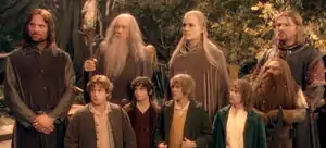 The eponymous Fellowship from left to right: (Top row) Aragorn, Gandalf, Legolas, Boromir, (bottom row) Sam, Frodo, Merry, Pippin, Gimli