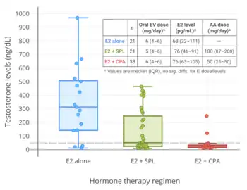 In addition to producing feminization, estrogens have antigonadotropic effects and suppress gonadal sex hormone production.[49][47][57] They are mainly responsible for the suppression of testosterone levels in transgender women.[49][57] Levels of estradiol of 200 pg/mL and above suppress testosterone levels by about 90%, while estradiol levels of 500 pg/mL and above suppress testosterone levels by about 95%, or to an equivalent extent as surgical castration and GnRH modulators.[58][59] Lower levels of estradiol can also considerably but incompletely suppress testosterone production.[47] When testosterone levels are insufficiently suppressed by estradiol alone, antiandrogens can be used to suppress or block the effects of residual testosterone.[49] Oral estradiol often has difficulty adequately suppressing testosterone levels, due to the relatively low estradiol levels achieved with it.[47][60][61]