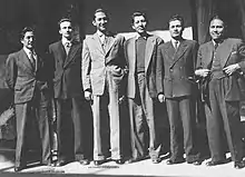 POR leaders, late 1940s. From left: Fernando Bravo James, Enrique Ferrante (?), Hugo González Moscoso, Miguel Alandia Pantoja, Ismael Pérez Alcalá, unidintified. (Photo: Fernando Bravo James Archives (FBJA))
