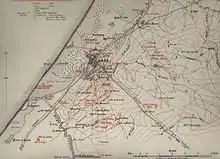 On 28 February, Chetwode's Desert Column occupied Khan Yunis unopposed and the headquarters of the Column was established at Sheikh Zowaiid, while Eastern Force headquarters remained at El Arish.[6] The ancient town of Khan Yunis on the main road to Gaza was said to be the birthplace of Delilah. With bazaars, narrow streets and a castle, it was one of several villages in this fertile area of southern Palestine, 6 miles (9.7 km) north of Rafa and the Egyptian–Ottoman frontier. Here was found the largest and deepest well in the area, and after engineers had installed a pumping machine, it gave an unlimited supply of water for both men and horses. The village quickly became an important forward site for supply depots and bivouacs.[8][25] Around Khan Yunis gardens, orange orchards, fig plantations and grazing were carried on by the local population, while in the Rafa and Sheikh Zowaiid areas barley and wheat were grown.[8][9][10]
