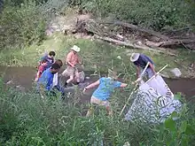 Twice a year, partners including The Nature Conservancy, the Bureau of Land Management, United States Fish and Wildlife Service, and Dr Peter Reinthal, professor at the University of Arizona, sample nine sites along the length of Aravaipa Canyon. Three of these sites are located at the west and east ends of the canyon respectively, and three are within the canyon itself. Various methods are used to survey the type and abundance of fish species present at each location. The most common of these is seining, a method that involves dragging a long net through the water and catching many fish at a time. This is best done by two individuals (one on either side of the net) who run downstream, scooping up the fish that are attempting to swim upstream against the current. Another form of seining involves the same two people on either side of the net, but this time they plant the edges of the net into the streambed. Then, another group of individuals form a line parallel to the net and kick up the water as they move toward the stationary net, driving fish into it. This approach works best on narrow side-channels that deviate from the wider stream's flow. Yet another, less-used method is known as electrofishing. This involves placing a set of electrodes in the water, which send out a low-level electric pulse, temporarily stunning the fish in the immediate area. This makes catching and identifying the fish somewhat easier than seining, but some may say it has ethical implications as it can occasionally cause death to some fish if not expertly done.[4]