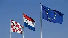 From left to right: The flag of North Brabant, The Netherlands and The European Union