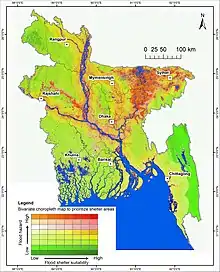 - 1 2 Uddin, Kabir; Matin, Mir A. (2021-10-01). "Potential flood hazard zonation and flood shelter suitability mapping for disaster risk mitigation in Bangladesh using geospatial technology". Progress in Disaster Science. 11: 100185. doi:10.1016/j.pdisas.2021.100185. ISSN 2590-0617.